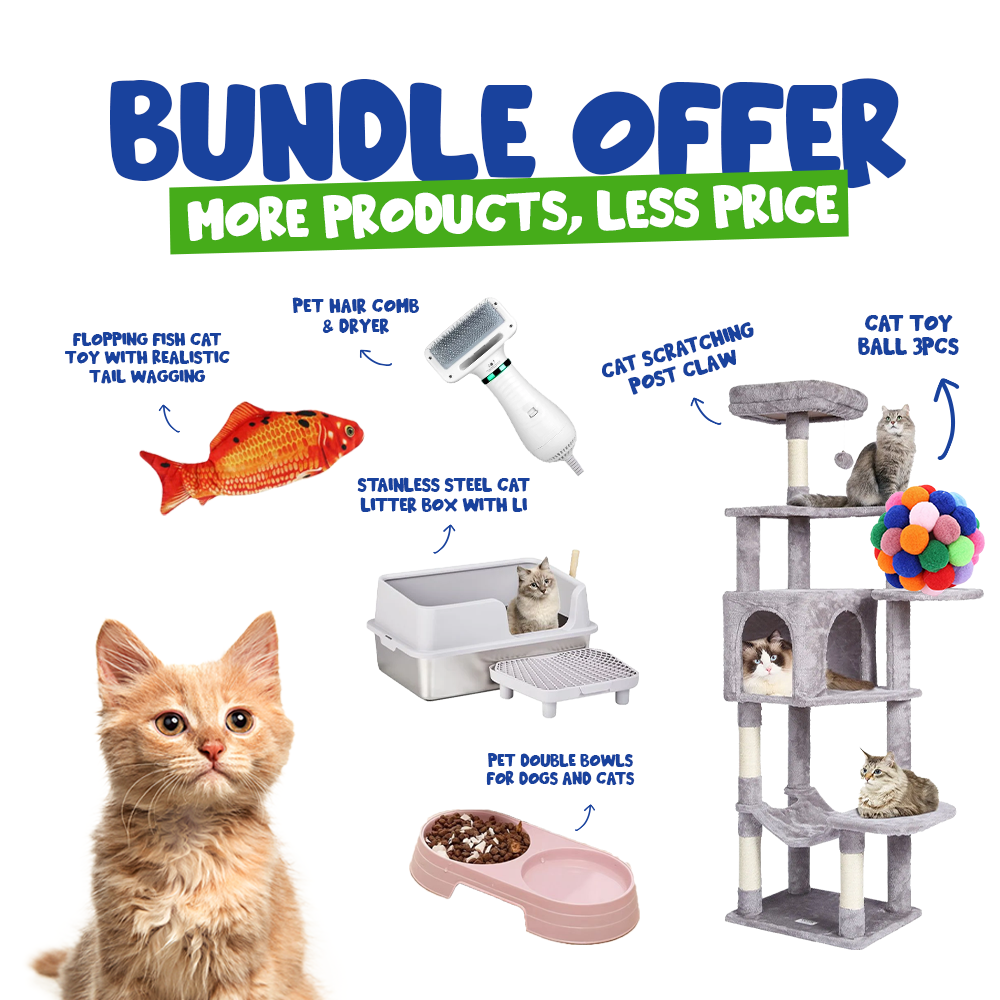 To support healthy habits and reduce furniture damage, the bundle includes a sturdy cat scratching post—ideal for natural stretching and claw care. A spacious, easy-to-clean litter box and scoop take care of bathroom needs, while matching food and water bowls keep mealtimes simple and mess-free.